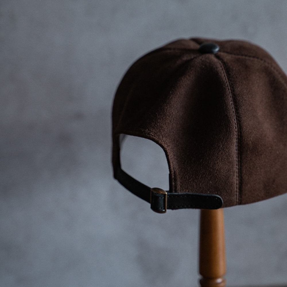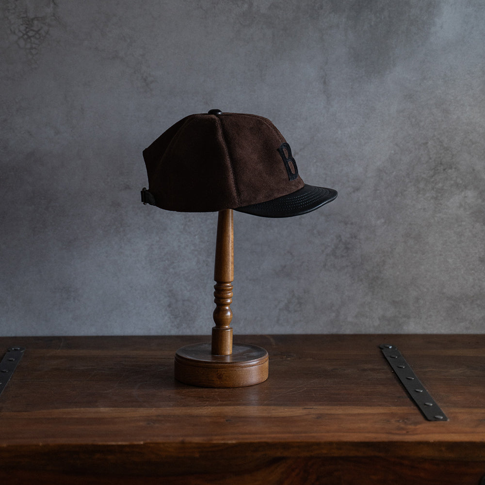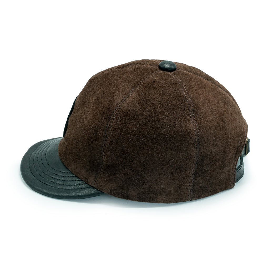 クラウンにブラウンのディアスエードを使用し、ブリムにはフルベジタブルタンニンなめしの牛革を、ブリム裏にはヌバックを使用したブリムの短いショートブリムキャップ。